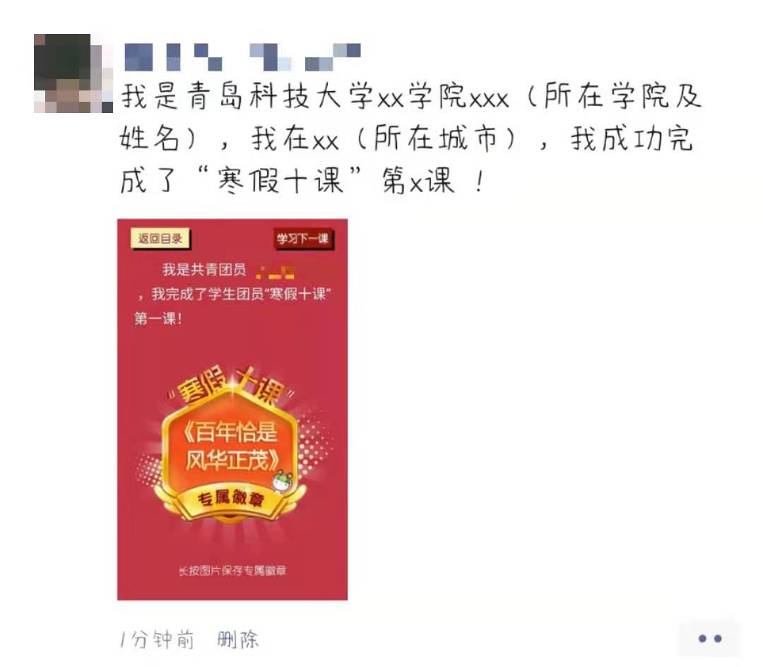 xx学院xxx(所在学院及姓名),我在xx(所在城市),我成功完成了“寒假十课”第x课!”,详情请见下图
