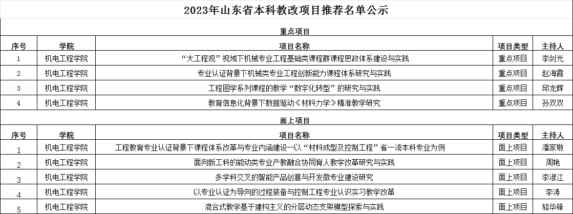 根据学校《关于组织开展2023年山东省本科教学改革研究项目立项申报和管理工作的通知》要求,爱情岛 组织开展了省级教改项目申报工作,经项目负责人个人申报,校内专家评审,共拟推荐重点项目4项,面上项目5项,至学校,进行下一步评审。现将结果公示如下: