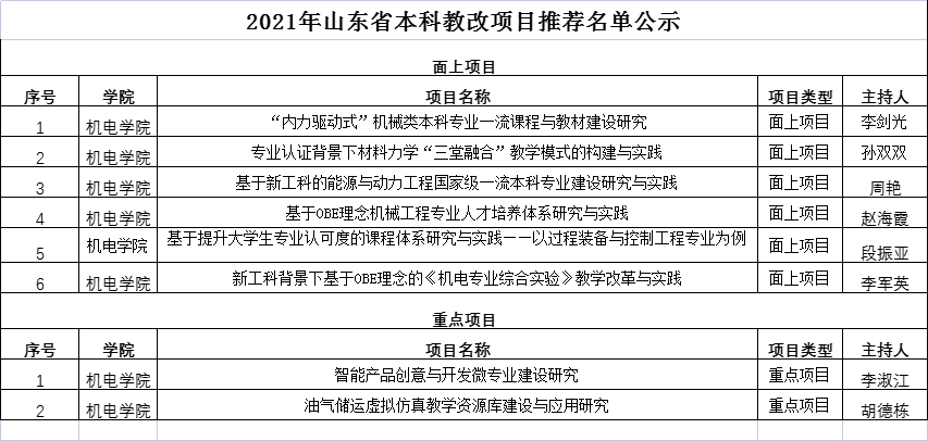 根据学校《关于组织开展2021年山东省本科教学改革研究项目立项及管理工作的通知》要求,爱情岛 开展了省级教改项目评审工作,经项目负责人申报,学院评审,共推荐新立项8项,现将结果公示如下: