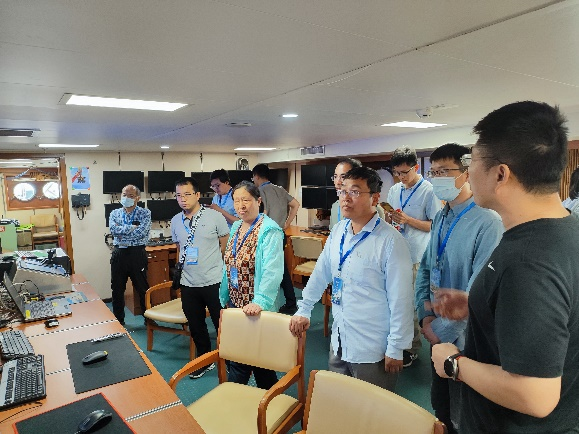 海洋所周主任和赵船长带领支部老师参观了船载实验室,部分党员老师与现场工作人员进行了一些实验学术交流。