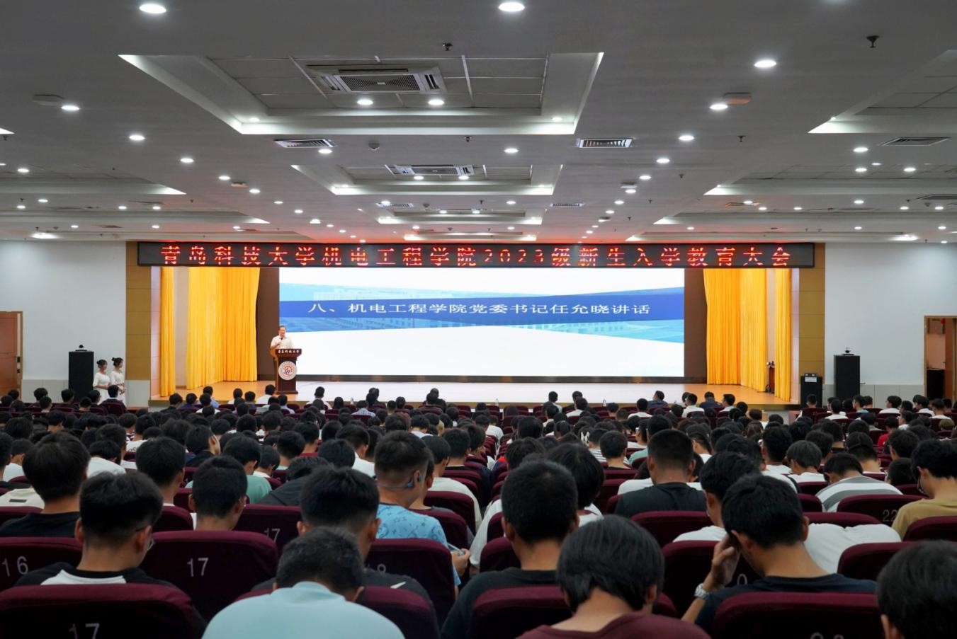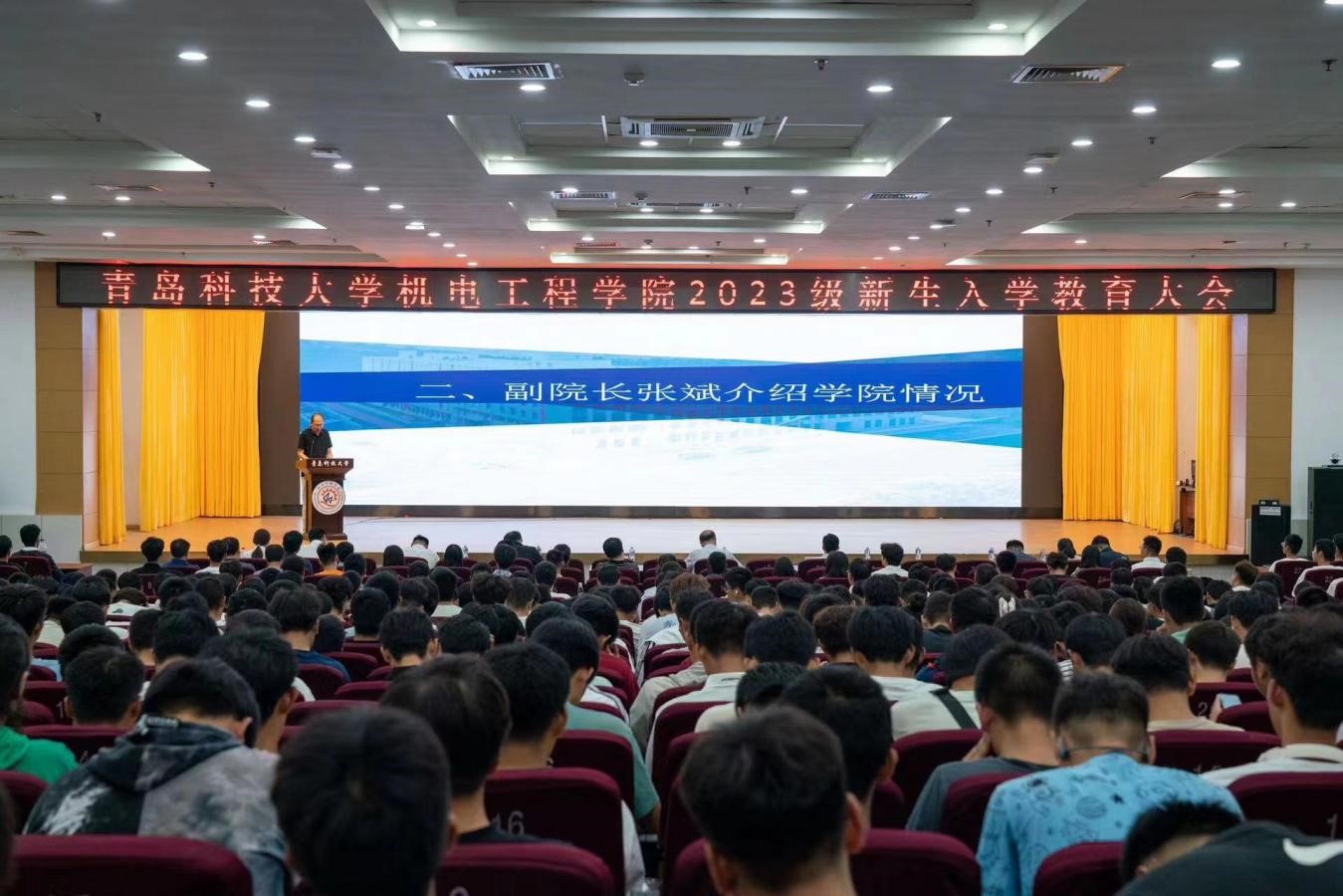在崂山校区第二报告厅举行2023级新生入学教育大会。学院党委书记任允晓、党委副书记兼副院长肖强,副院长张斌、李剑光,班主任代表,学院全体辅导员,2023级全体新生参加会议。会议由学工办主任、团委书记王娟娟主持。