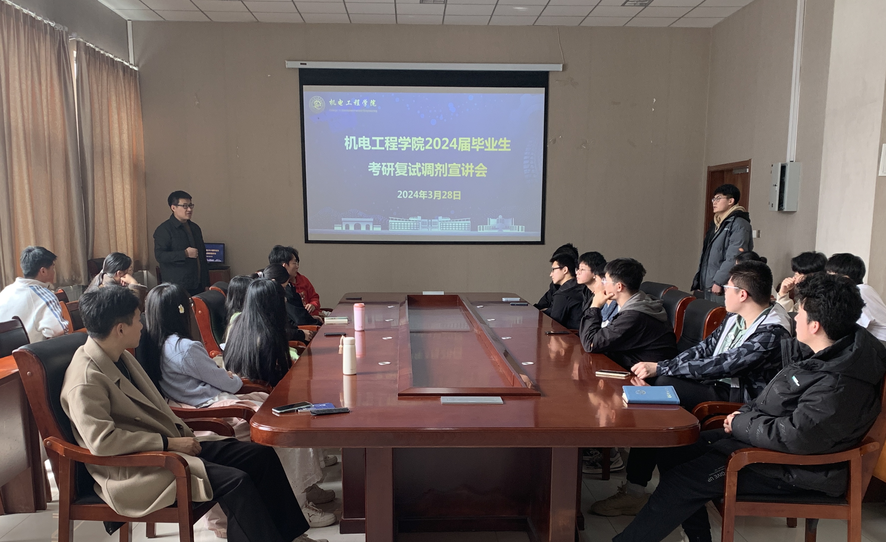 2024届毕业生考研复试调剂宣讲会在机电楼518会议室举办。副院长刘治明参加会议并进行复试调剂指导,毕业班辅导员、2024届考研学生代表参加宣讲会。