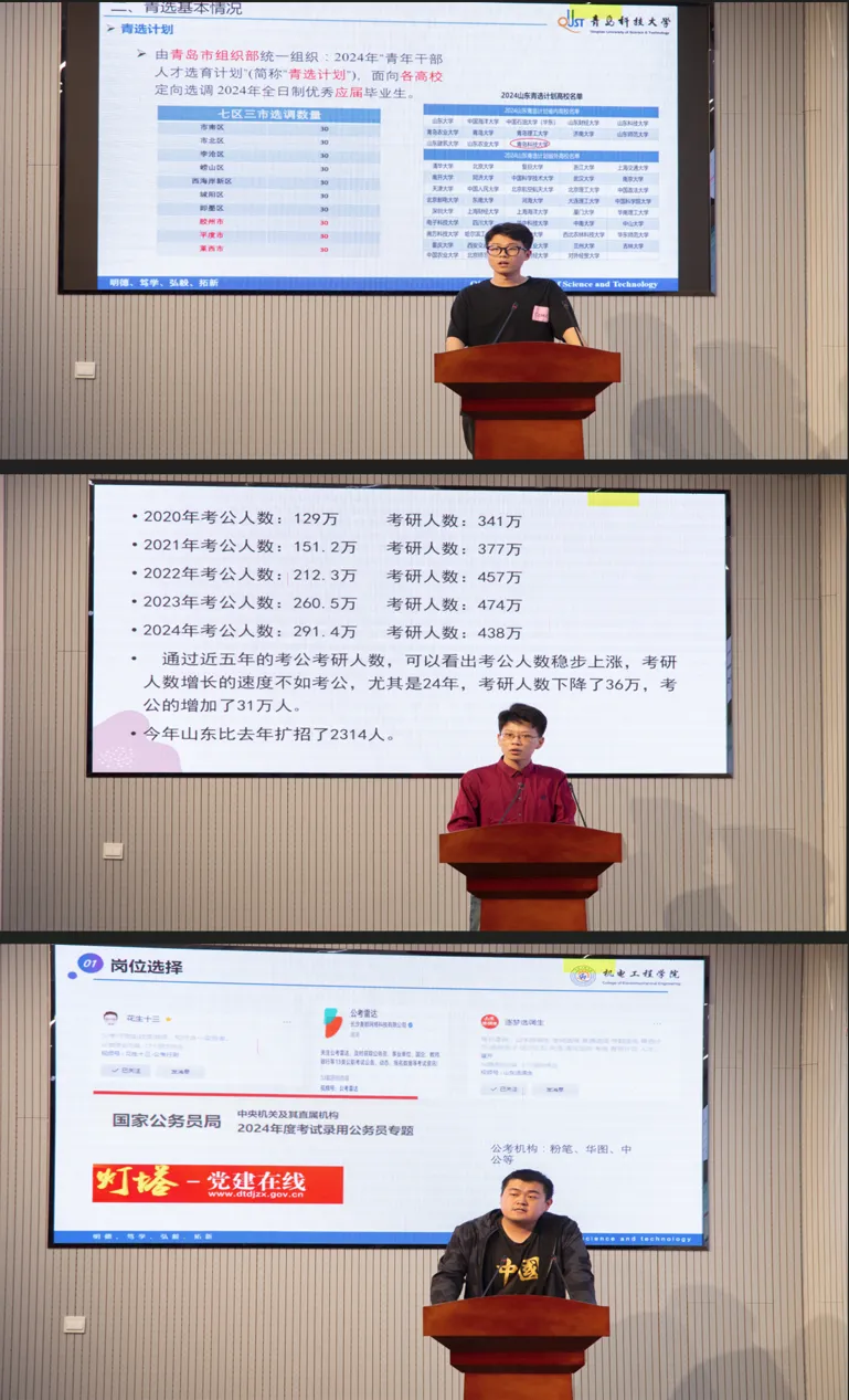 基层就业学生代表彭泰源、夏正、任仲哲分别结合自己的备考经历,从前期准备、备考策略、面试技巧、心态调整等多个方面进行了详细的阐述,并鼓励同学们制定合理的学习计划,夯实基础知识,提高自身综合素质,为后续环节做好充分准备。
