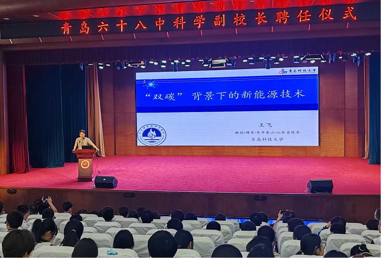 王飞教授应邀出席并受聘担任青岛六十八中科学副校长。作为青岛六十八中科学副校长,王飞为现场师生做了题为《“双碳“背景下的新能源技术》的报告。