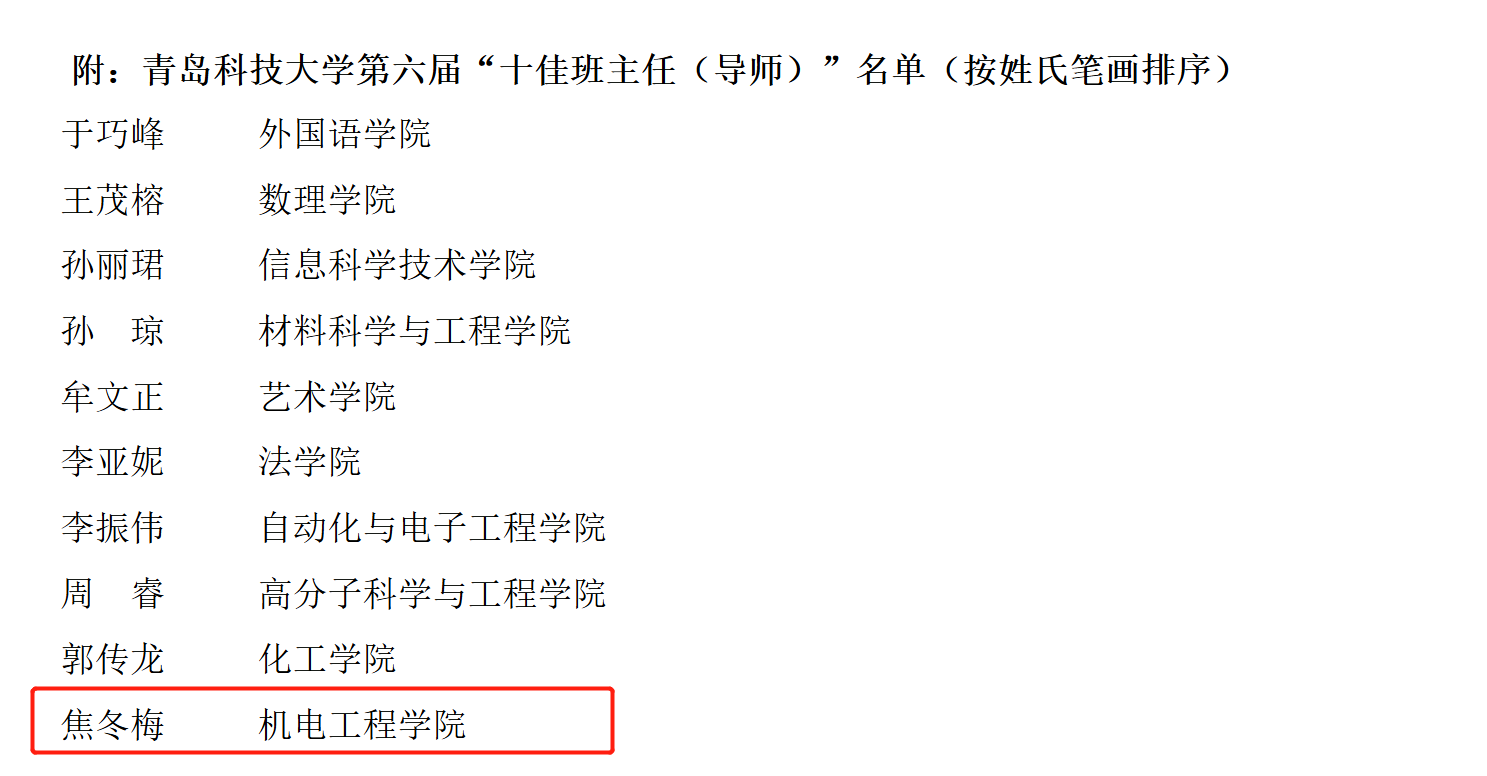 十佳班主任(导师)评选办法》(青科大学字﹝2014﹞30号),学校组织开展了第六届“十佳班主任(导师)”评选。经过学院(校区)推荐、学校审核、学生评议、网络投票和评审委员会投票等环节,拟确定焦冬梅等10名班主任(导师)为爱情岛
