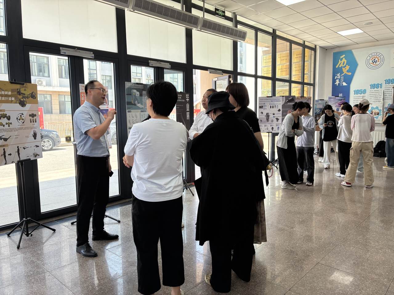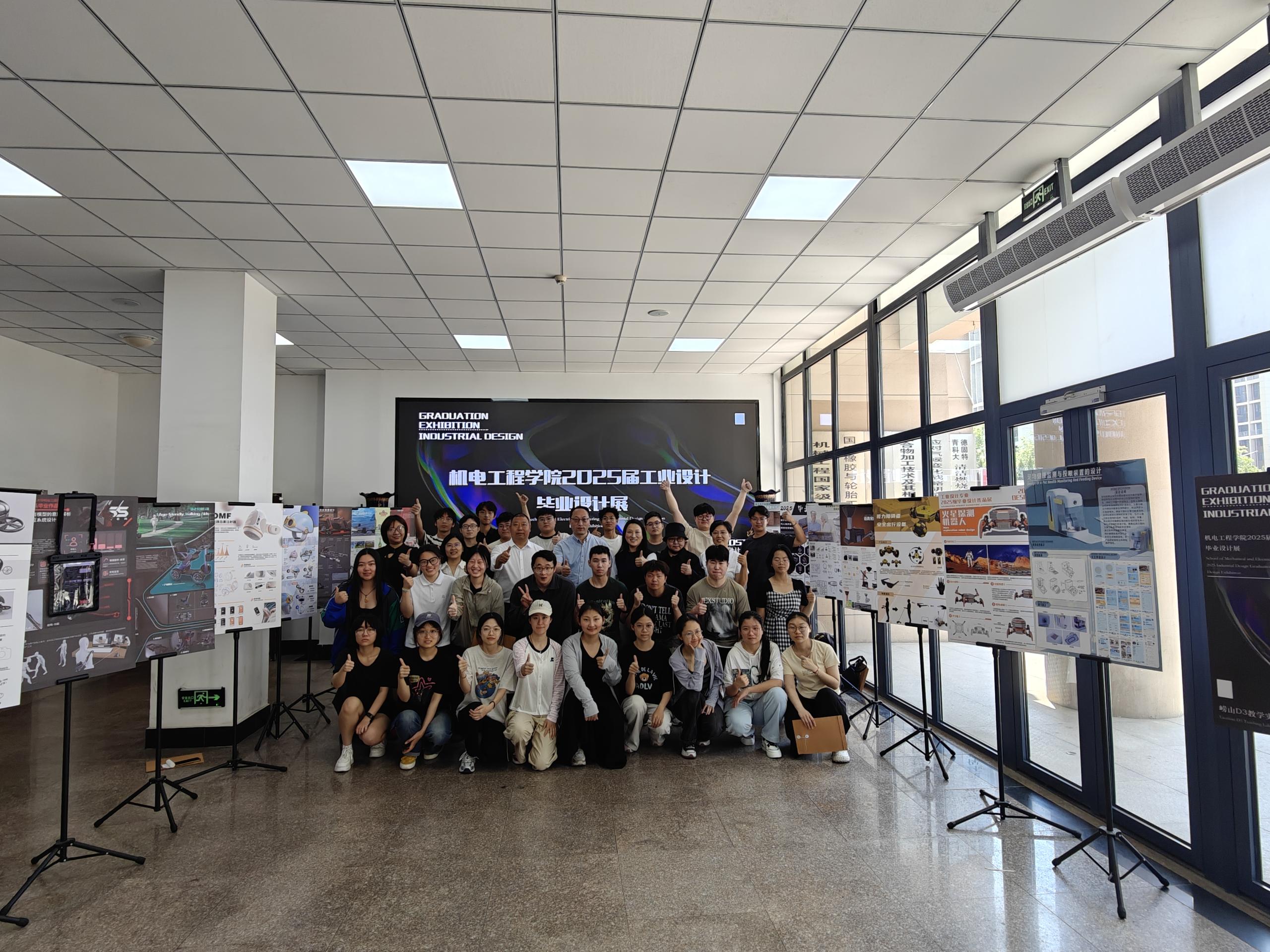 一楼大厅举行,28名毕业生的作品集中亮相,全方位展现了“新工科”背景下工业设计专业人才培养的成效。学院党委副书记杨小明、副院长李剑光、工业设计系全体教师、2025届工业设计专业毕业生共同参加毕业展。