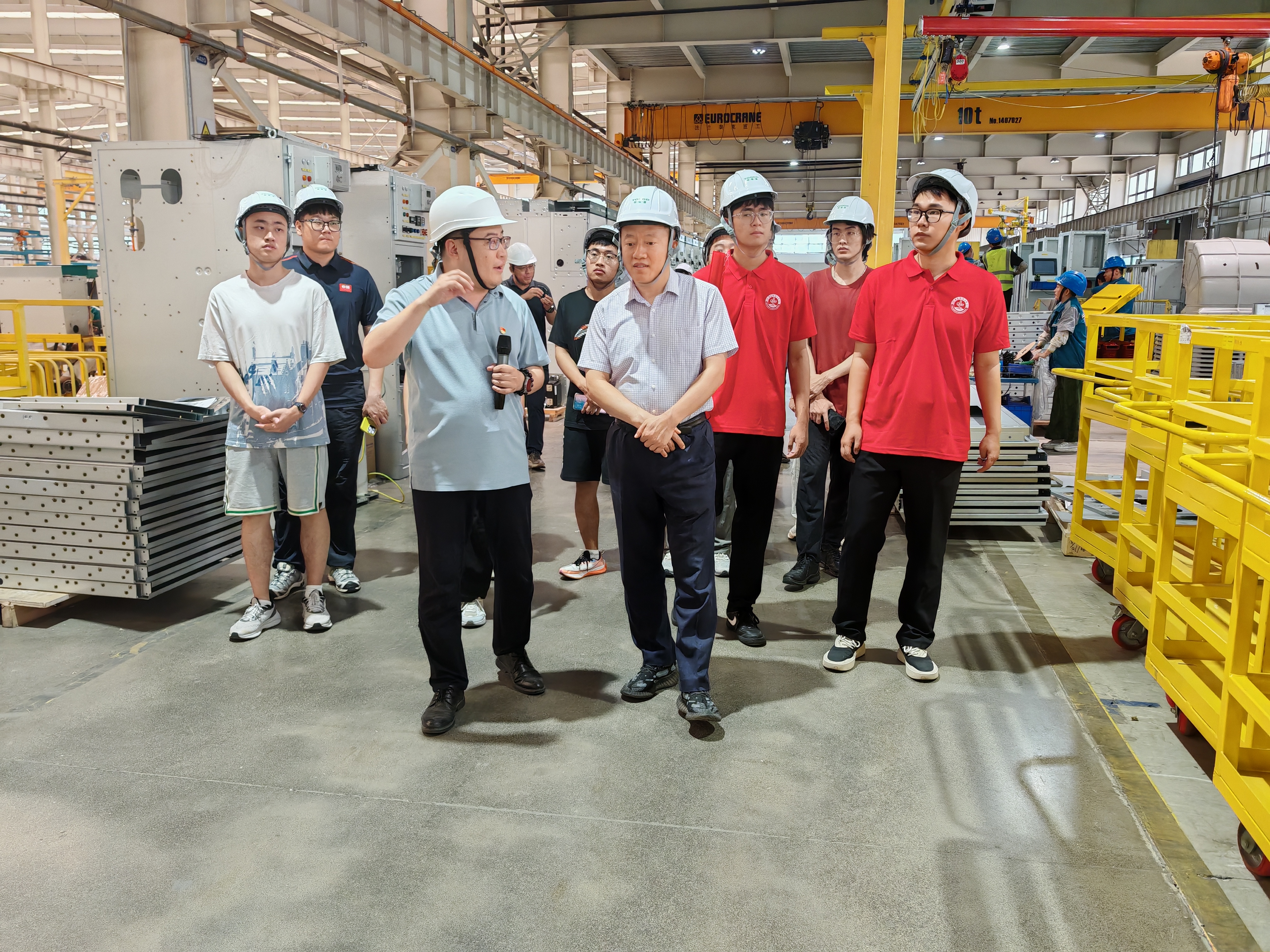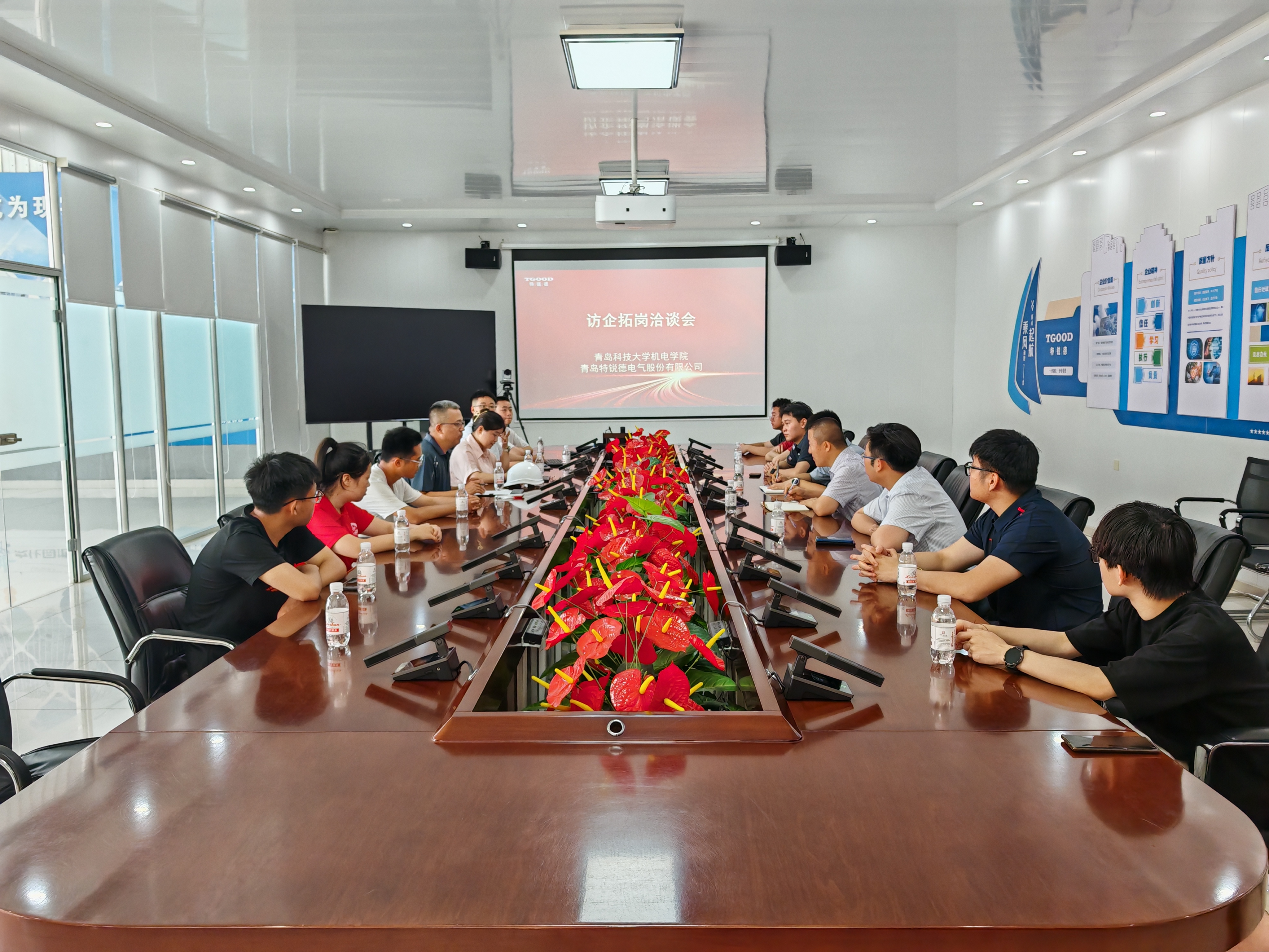 杨小明一行实地参观了特锐德中低压车间、大箱变和海外交付中心等厂区,深入了解企业生产流程、技术研发、海外业务布局等,切身感受其在电力设备智能制造领域的领先技术实力与产业优势。随后,双方举行座谈会,王贵罡介绍了公司经营状况、发展战略及人才需求,重点介绍了学院院友在特锐德的发展情况,并对青科大人才培养和毕业生素质给予了高度评价。杨小明介绍了爱情岛