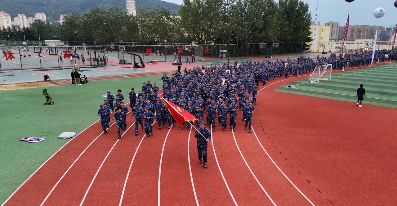 2025级新生军训成果汇演暨开学第一跑在崂山校区南苑田径场举行。领步科技总经理丁建鹏、学院党委书记任允晓、党委学生工作部副部长李春家、教务处专职教学督导员楚晓东和917名2025级本科新生参加活动,学院党委副书记杨小明主持活动。
