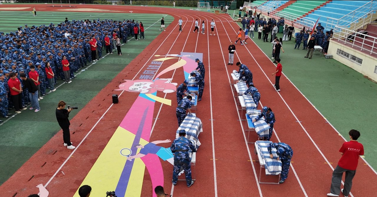 随后,学院以班级为单位进行了军训成果汇演,分列式上,各班级方阵步伐整齐、口号嘹亮,以昂扬的姿态通过主席台,尽显机电学子的青春风采与奋进精神。叠军被表演紧张有序,同学们动作娴熟、精准利落,方寸之间彰显严谨作风。拔河表演赛中,队员们齐心协力,为集体荣誉而战,加油声、欢呼声此起彼伏,将现场气氛推向高潮。