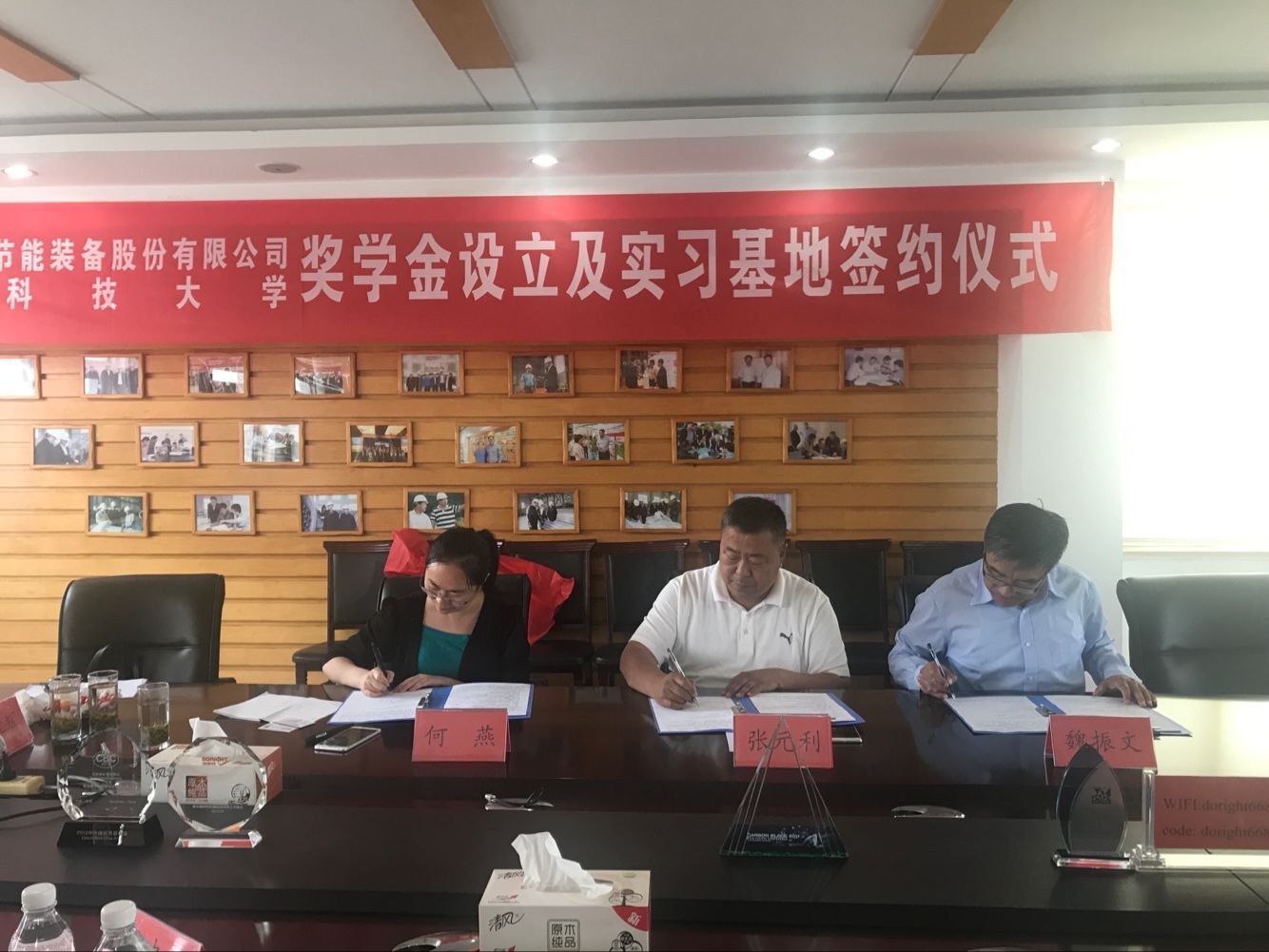 张元利、何燕和魏振文代表三方签订捐赠协议书和产学研战略合作协议书,并为大学生实习基地揭牌。仪式上,张元利向青岛德固特节能装备股份有限公司表示衷心的感谢,指出“德固特奖学金”的设立体现了企业对学校教育事业的支持和社会责任的担当,并介绍了学校的基本情况,产学研成果转化方面所取得的成绩、经验和今后采取的措施与努力方向。