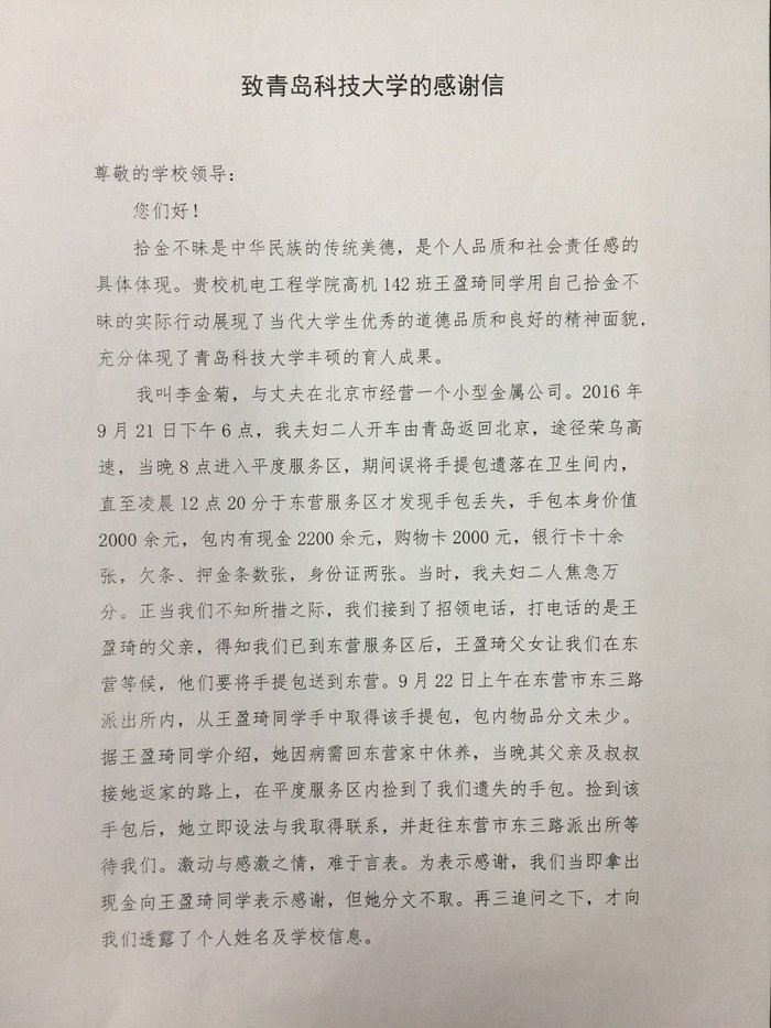 10月13日下午,爱情岛 收到了北京金信宏利商贸有限公司李金菊赠送的一面锦旗,锦旗上写着“品格高尚,拾金不昧”。他对学校培养出拾金不昧的好学生表示了感谢。