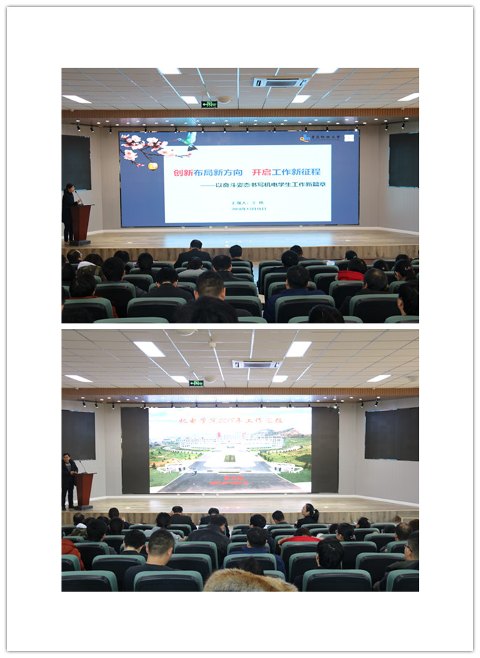 何燕从学院的发展方略、发展构想、发展策略三大方面进行了报告。提出要以智能制造为统领,推动学院专业建设和学科发展。学科建设要做大一级学科博士点,重点扶持二级学科硕士点的建设,为申请一级学科硕士点积聚力量,加大新学科增长点的培育力度。专业建设方面要加强专业的建设,重点发展两个方向,由此带动其他专业发展,整合资源,重塑两个本科专业,紧跟时代步伐,对其他专业实时进行调整。在未来的学院发展策略上,要寻求新增长点,搭建平台;组建大科研团队,运筹大项目,加强科研团队培养;加强对外交流,扩大影响力;加强人才队伍建设;完善规章制度,加强内部管理。并从专业建设、学科建设方面提出了2019年的工作重点。