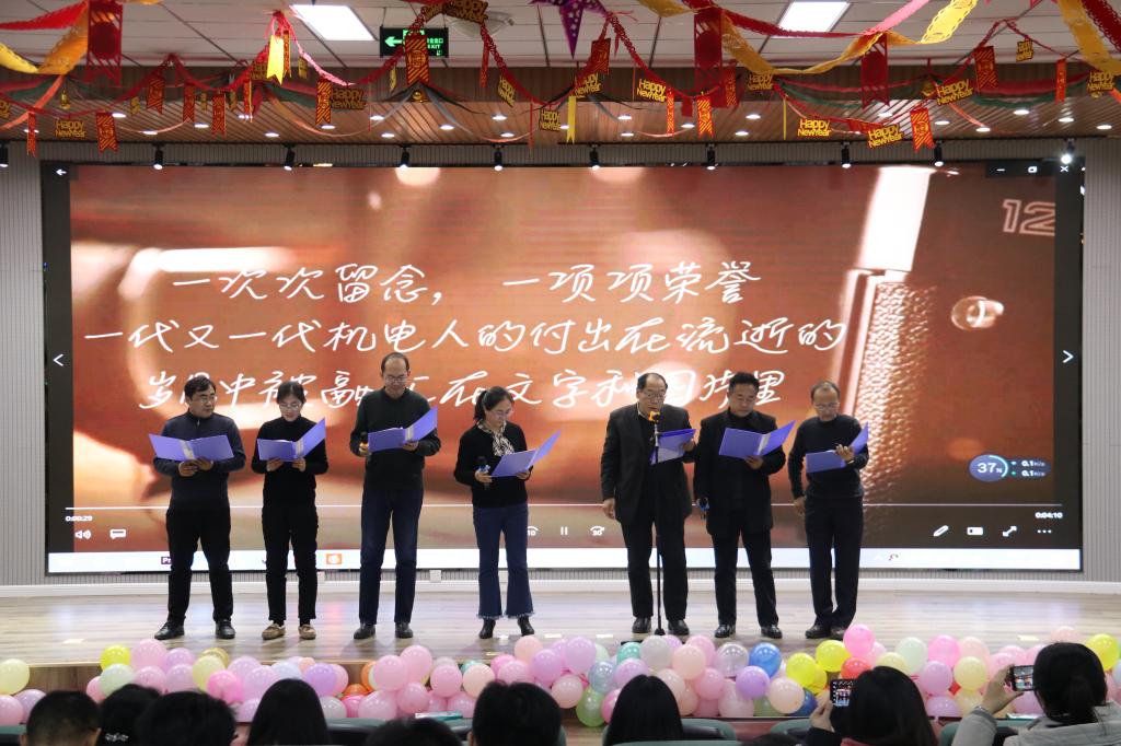 的祝福;《朋友》、《兰花草》、《隐形的翅膀》歌声洋洋盈耳,《团结就是力量》、《青苹果乐园》等歌声娓娓动听。一曲曲合唱,掀起一波又一波的高潮。对唱《天籁传奇》引起阵阵掌声,点燃了现场气氛。学院党政领导诗朗诵《春风第一枝》声情并茂,激昂澎湃,回顾了机电的风雨历程,体现了对机电的热爱和作为机电人的自豪。《欢乐一家人》、《海草》的舞蹈动作活力迸发,令众人捧腹,给大家带来了欢乐。
