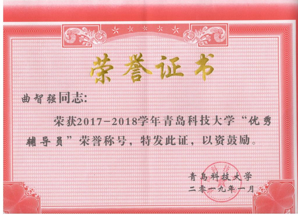 曲智强老师荣获校优秀辅导员。