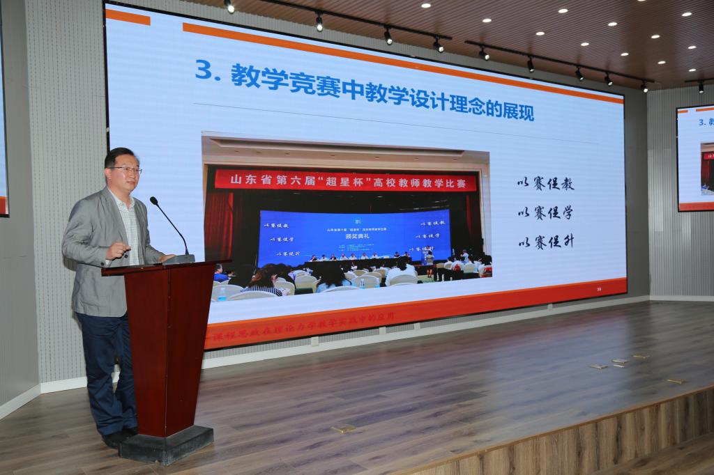 会上首先由力学教研室教师李剑光给大家做课程思政报告,主要从过去为什么未进行、现在为什么要进行、怎么进行课程思政等几个方面进行了汇报,并谈了自己对课程思政的感想。山东省第六届“超星杯”高校教师教学比赛暨青年教师教学一等奖获得者朱惠华主要从课程思政在理论力学教学实践中的应用给大家进行报告,重点给大家做了课程思政在教学中的示范、课程思政在教学过程中如何无缝植入和教学竞赛中教学理念的展现。