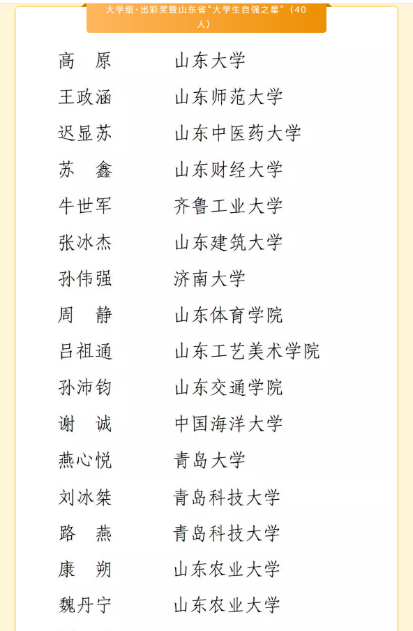 近日,在山东省学生联合会公布的2019年“大智之星”齐鲁学子奖学金获奖名单公示中,我院学子刘冰桀荣获大学组--出彩奖暨山东省“大学生自强之星”。