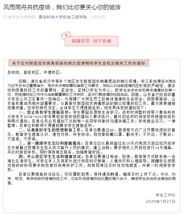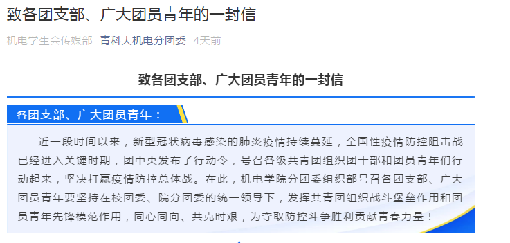 分团委组织部发表《致各团支部、广大团员的一封信》,号召各团支部、广大团员青年要坚持在校团委、院分团委的统一领导下,发挥共青团组织战斗堡垒作用和团员青年先锋模范作用,同心同向、共克时艰,为夺取防控斗争胜利贡献青春力量!号召机电学子服从指挥有纪律、正确发声有作为、履行职责有担当、网络学习由效率。爱情岛