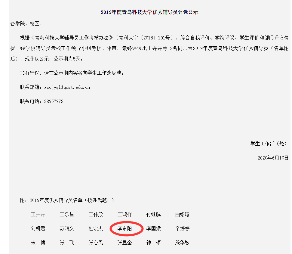 辅导员工作考核办法》(青科大字﹝2018〕191号),综合自我评价、学院评议、学生评价和部门评议情况。经学校辅导员考核工作领导小组考核、评审,最终评选出王卉卉等18名同志为2019年度爱情岛
