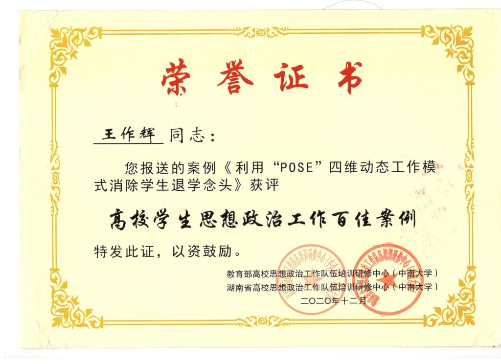 学工办主任兼团委书记王作辉申报的《利用“POSE”四维动态工作模式消除学生退学念头》成功入选《高校学生思想政治工作百佳案例》。
