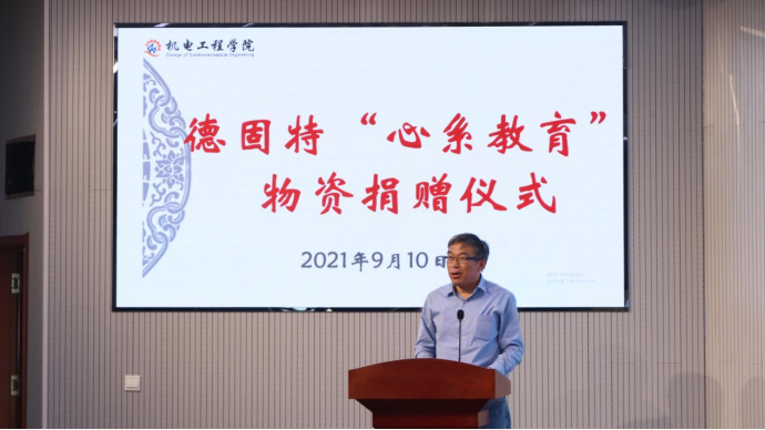 绿色发展办公室主任张江辉老师介绍学院与德固特公司合作情况及发展前景,德固特公司领导为学院教师代表赠送物资。