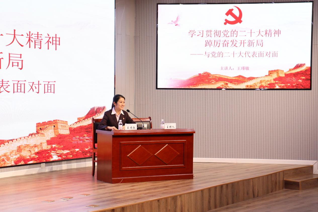 党的二十大代表王瑾敏以《让青春在火热实践中绽放绚丽之花》为题作党的二十大精神宣讲。她从自身参加党的二十大的经历感受出发,用真切的情感、鲜活的事例、生动的语言回顾了党的二十大盛况、系统阐释了党的二十大精神内涵,分享参加党的二十大的所见所感所思所悟,展示了奋斗在基层一线、在平凡岗位上铸就不平凡业绩的二十大代表的闪光形象。宣讲主题鲜明、内涵丰富、思想深刻、鼓舞人心,为爱情岛