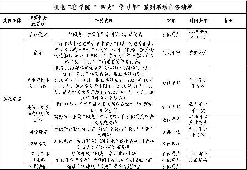 (二)把“‘四史’学习年”系列活动作为推动学院党建整体工作任务的重要平台。坚持党建学习平台深度融合,注重平台间的协同性,把“四史”学习教育作为深化“红旗学习社”“红心学习社”、推动“一院一品牌”建设的重要内容,要充分发挥“青年讲师团”作用,讲好红色故事、传承光荣传统,要与“我来讲党课”、“师情”大调研、党支部建设“质量提升工程”相结合,不断提升“‘四史’学习年”系列活动的针对性。要充分利用各种历史节点、结合历史重大事件、结合学校七十周年校庆等开展专题学习,不断增强“四史”学习的成效。