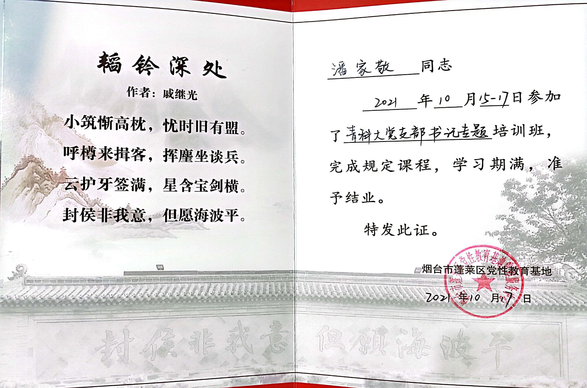材料成型及控制工程教研室党员教师始终坚持把“立德树人”作为教育的根本任务,积极开展课程思政,并与党建有机结合。全体党员勤奋刻苦、真抓实干、锐意进取,潜心育人,发挥了很好的模范带头作用和战斗堡垒作用。在学校的组织下,党员教师潘家敬赴烟台蓬莱党性教育基地进行了青科大党支部书记专题培训,并顺利结业。