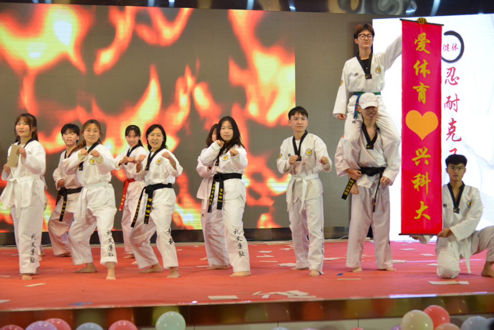 第二篇章《爱体育·兴科大》,V-show体育舞蹈社的《飞天》,生动演绎中华传统文化之源远流长、博大精深;梅花桩武术协会、弈剑阁陈氏太极拳协会带来的武术表演《强体魄·扬国威》,展现中华传统武术的魅力;跆拳道协会带来的《青科大力量》彰显青春力量;跳绳协会、青稞动漫社的《天行健·绳彩飞扬》以“光影”诠释运动风采。舞蹈、跳绳、武术、轮滑、跆拳道的融合表演,充分展示了学校体育综合改革之体育类社团打造“月月有联赛、周周有比赛、人人都参赛”体育联赛平台的阶段性成果。