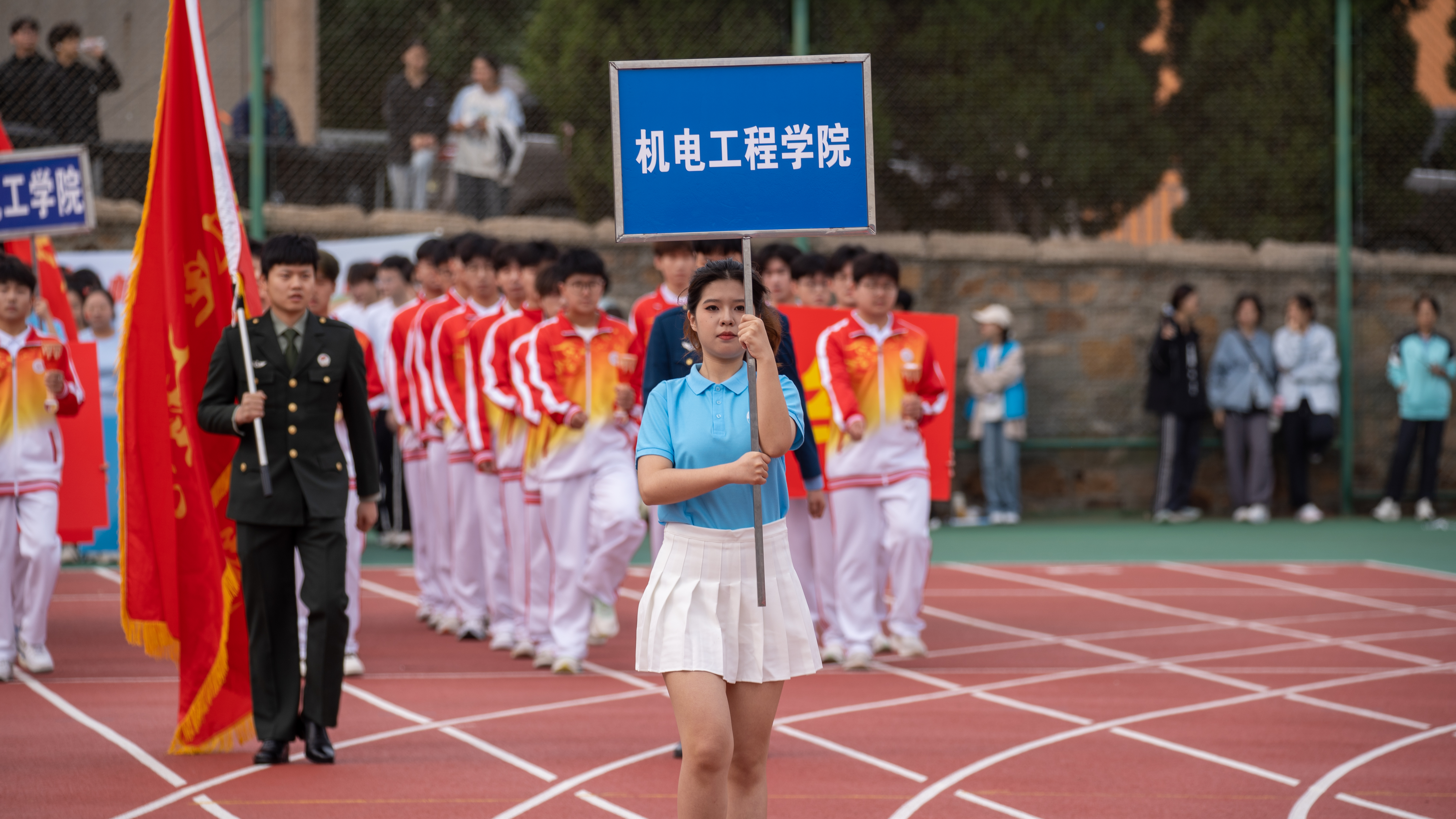 方队以整齐的步伐和饱满的精神惊艳全场。48名机电学子身着鲜艳的院服,手持火炬,展现出机电人特有的坚毅与自信。