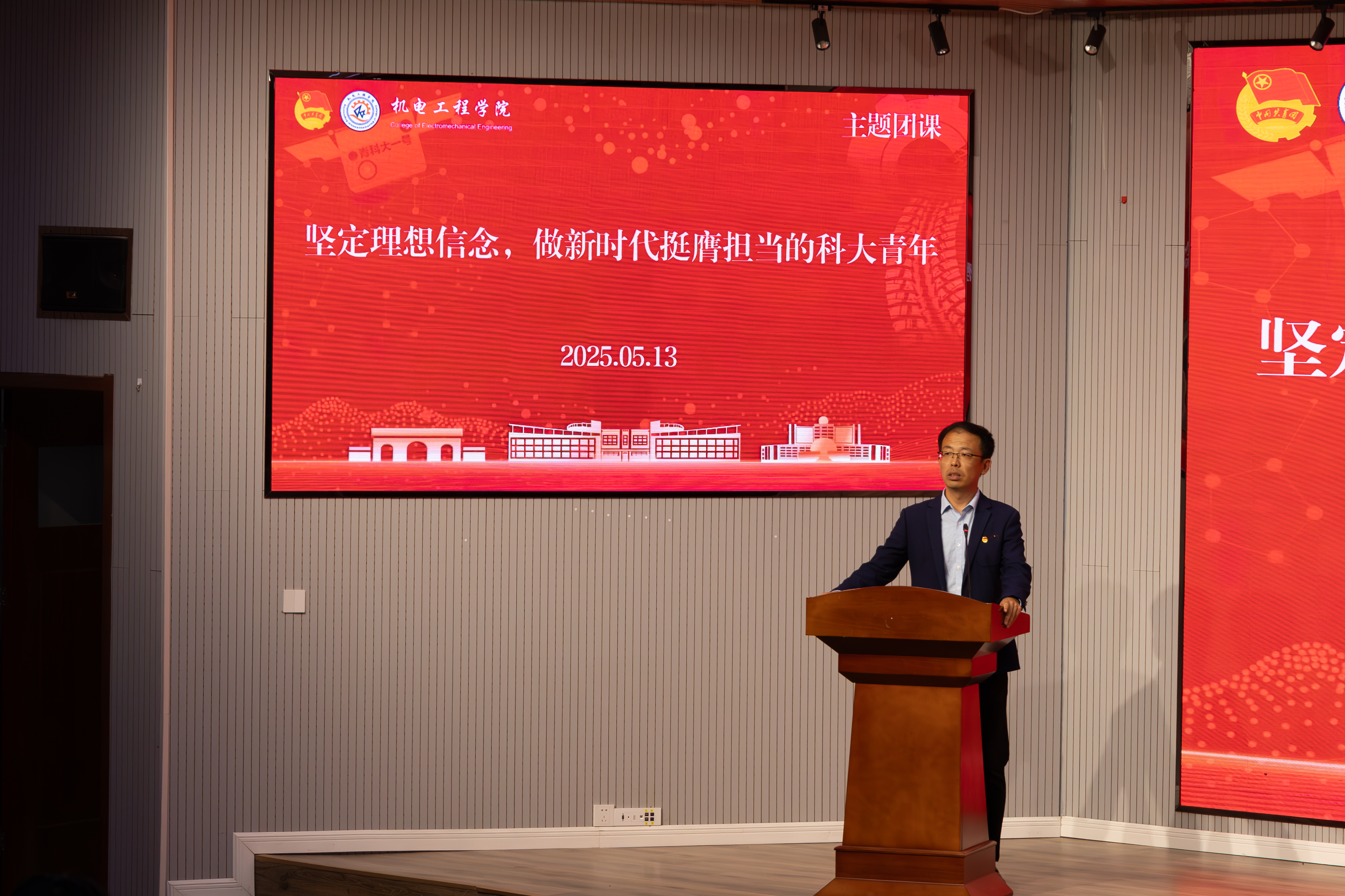 会上,学院团委书记逄柏鹏结合丰富案例,深入阐述理想信念的重要性,引导青年学子将个人成长与国家发展紧密相连。最后,逄柏鹏寄语在场青年学子:“共青团员的身份是荣耀,更是责任。希望全体团员坚定理想信念,以挺膺担当的姿态投身学习和实践,争做新时代科大青年的表率。”