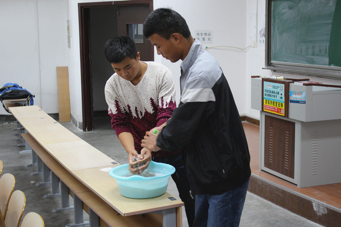 短暂的任务分配过后,同学们进入明德楼指定教室并与教室内正在自习的同学进行了协商,之后便开始了迅速而又高效的卫生清洁工作。各部门成员分工明确,工作细致认真,对黑板、桌椅、桌洞、椅背等进行了全方位无死角的清理,在洗衣粉的帮助下,将课桌上的笔迹、贴纸等全部清除。负责整理讲桌的同学更是将粉笔细致分类,将粉尘全部用抹布擦掉,不留一点白色。经过半个小时的清理过后,各教室已焕然一新,没有垃圾,没有粉尘,只留下一片净土供老师授课和同学们学习。活动最后,同学们集体在明德楼广场前合影留念,拉起横幅来迎接党的十九大召开,迎接文明整洁的新校园。