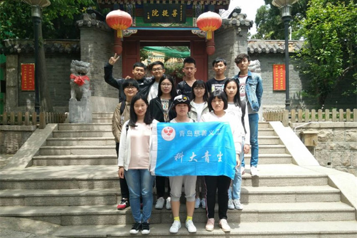 青尘义工队队员前往湛山寺进行卫生清理工作。在湛山寺门口,义工队员与一同参加活动的青岛大学青峰义工队、小学生义工队集合并进行各队自我介绍和任务分配。
