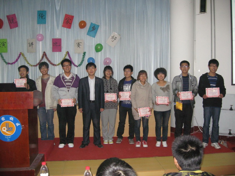 来自各专业的41名同学参加了此次比赛。比赛借助PPT,在5分钟之内介绍自己家乡的风土人情。比赛中,各参赛选手满怀着对家乡的热爱之情,用最激情、最富有诗意的语言向大家介绍了自己的家乡,选手们从人文历史、特色小吃、风土人情等方面向大家介绍了自己家乡的美好,从苍茫辽阔的蒙古草原到风景优美的湖北宜昌,从精美石刻的济宁到白雪皑皑的吉林,无不展示了祖国的地大物博。其中来自热能113班的颜艳同学,用幽默的语言介绍了吉林松花江的风俗人情,尤其是关于伪满洲的介绍,让同学们仿佛置身其中,令人神往。经过一天的比赛,最终凭借出色的表现和发挥,来自热能112班的王栋同学获得一等奖,荆鹏超、颜艳获得二等奖,赵灵利、张庆彪、柳珂获得三等奖,张越获最佳人气奖,张洪存获最佳PPT奖。与会的评委为获奖同学颁发证书和奖品,并合影留念。