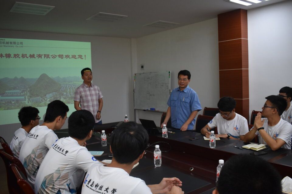 师生,他向在座的师生表示热烈的欢迎,并随后介绍了公司现在的经营状况、获得的荣誉、公司的人员结构以及公司的品牌产品。桂林橡胶机械有限公司技术部高鹏校友向在座的师生做了产品方面的交流,并诚挚邀请学校的学弟学妹们在毕业之后加入桂林橡胶机械有限公司。