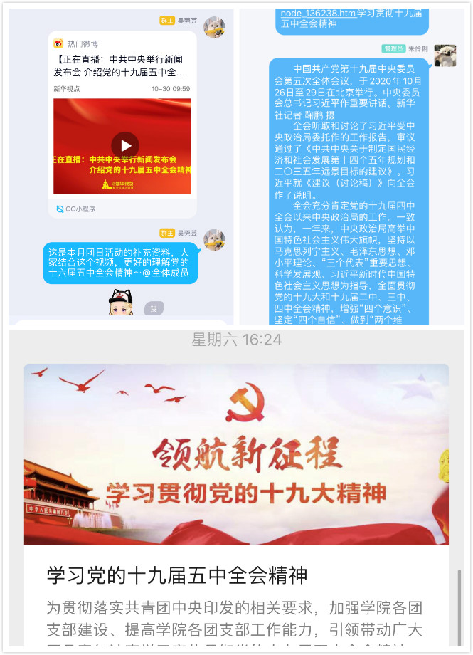 各支部采取团支部大会、团小组会、知识竞赛、线上学习讨论、集中观看学习、集中研讨学习、网络宣传等多种方式进行学习,运用“线上+线下”方式,统筹新闻宣传、理论研究,尊重团员学习习惯和任职规律,充分发挥新媒体优势,穿插学习,运用“小方法”讲好“大故事”,生动、具体宣传全会精神。