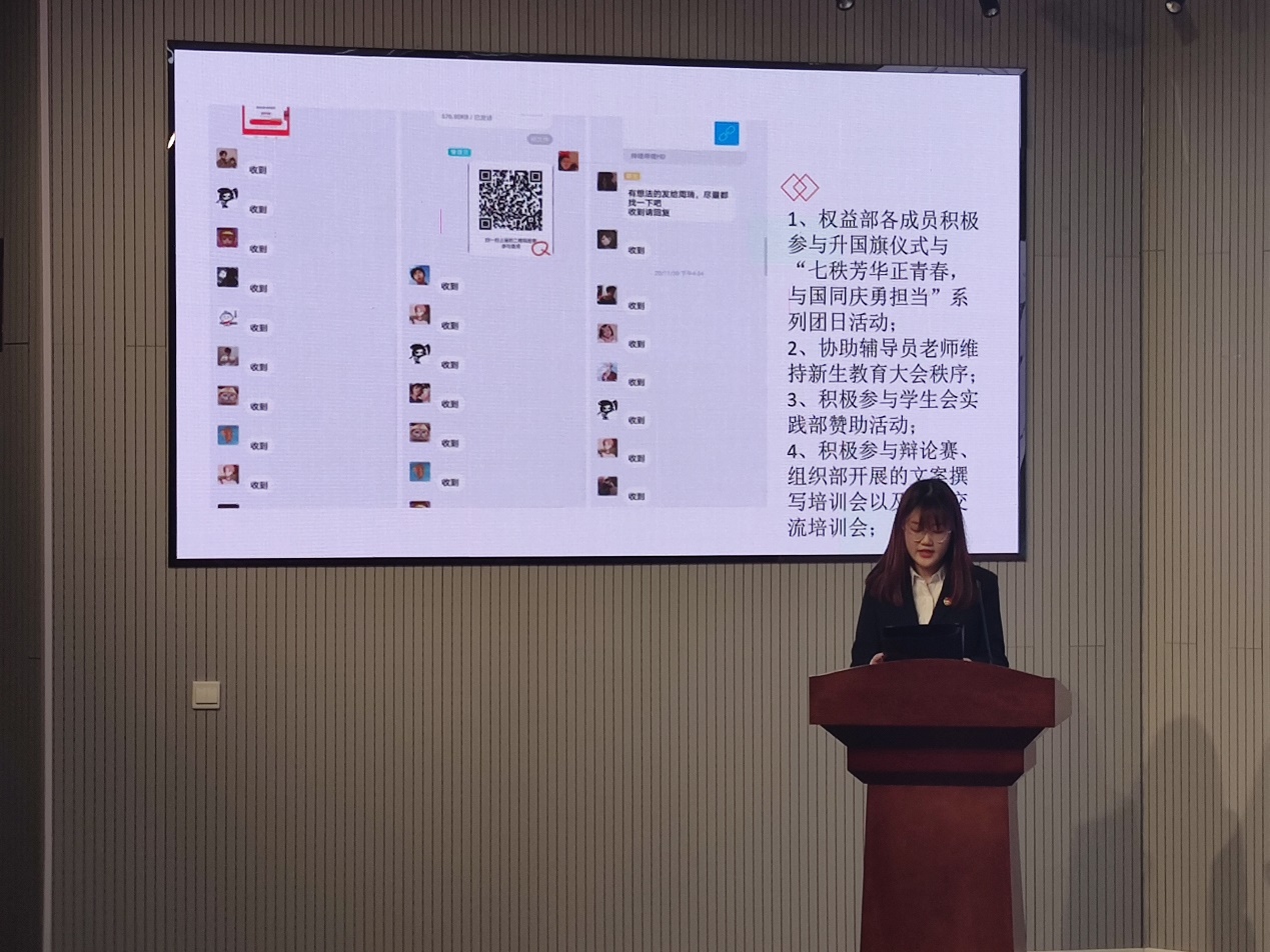 学生会的工作开展情况,各部门针对本部的工作情况面向学生会全体同学进行述职汇报 。